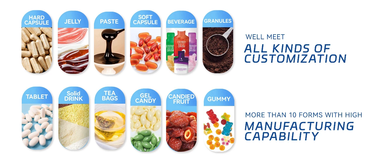 Produk utama: Gummies, minuman bubuk, kapsul keras, softgel, tablet